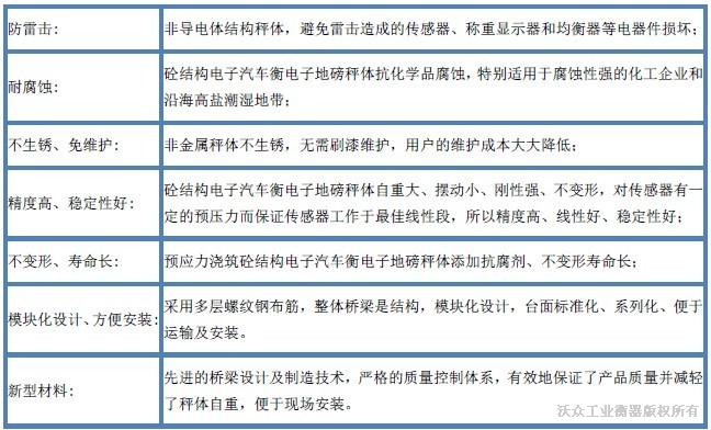 砼結(jié)構(gòu)汽車衡電子地磅俗稱“水泥秤”\“電子地磅”,以混凝土結(jié)構(gòu)臺面取代傳統(tǒng)的鋼結(jié)構(gòu)臺面,防雷擊、耐腐蝕、免維護(hù)、使用壽命長,性能穩(wěn)定,從根本上解決了鋼結(jié)構(gòu)汽車衡的一些無法解決的問題,已在國內(nèi)外得到廣泛的應(yīng)用。從目前世界橋梁技術(shù)的發(fā)展可以預(yù)見,以前我們常見的鋼結(jié)構(gòu)橋梁將逐步被砼結(jié)構(gòu)橋梁所取代,高鐵則全部采用砼結(jié)構(gòu)的橋梁和路基,這些都足以證明砼結(jié)構(gòu)的穩(wěn)定性和可靠性。 廣泛應(yīng)用于工礦企業(yè)、港口碼頭、礦山、冷庫、生鮮交易市場、公正計(jì)量站等,特別適用于有化學(xué)品腐蝕的化工企業(yè),沿海高鹽潮濕地帶等場所。