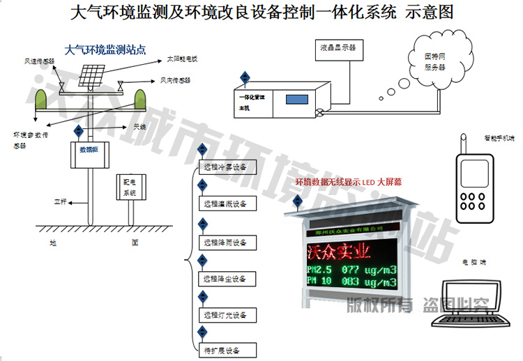 1、 本系統集成化高,功能強大。不但可以對環境數據進行實時監測還可對環境大氣治理設備進行開啟、關閉、定時等遠程控制。系統分為兩大部分,一部分為環境數據實時監測(包含有:風速、風向、溫度、濕度、大氣壓、PM2.5、PM10、二氧化硫SO2、一氧化氮、CO、臭氧O3等大氣環境參數),一部分為環境治理設備及其他相關設備的遠程遙控控制。兩部分可分開運行也可獨立運行,本系統核心為一體化管理主機。
